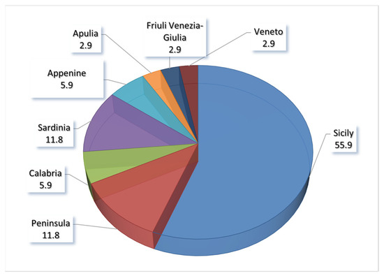 The geographical distribution of the endemic CWR species in Italy shows that almost 2/3 grow in the Sicily region. These data can be justified for the peninsular regions, but not find a rational reason for Sardinia, comparable those to Sicily for geographical extension and climatic characteristics. In particular the genus B. with 10 endemism, of which 9 exclusive to Sicily, with 5 subspecies of B. villosa, explains this discrepancy data (Figure 2). It is also true that Sicily having a greater extension of cultivated environments in relation to Sardinia, and being one of the main centers of the diversification of wild taxa of Brassica sect. Brassica in the Mediterranean basin, favors the crossing with the cultivated species [13,18,19].