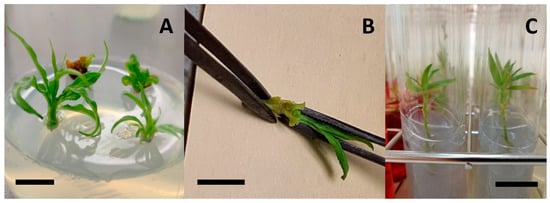 Micrografting of Prunus dulcis. Establishment and multiplication of rootstocks (A); slit micrografting (B); and micrografts in MS medium (C). Scale bar—1cm. The micrografts were cultured in MS medium + 30 g/L sucrose + 7 g/L agar (M1 medium); M1 medium + 1 mg/L BAP; M1 medium + 2 g/L AC. The micrografting success were evaluated after 2 months.