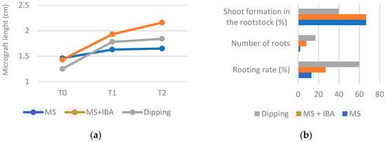 Effect of auxin IBA on micrografting. (a) Micrograft length evaluation after (T0), 1 month (T1) and 2 months (T2) of micrograft; (b) Shoot formation in the rootstock (%), number of roots and rooting rate (%), after 2 months of micrografts. Significant differences were registered between MS and MS + IBA on micrograft length after 2 months (T2), at p ≤ 0.05, using Kruskal–Wallis test.