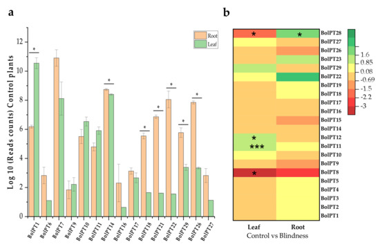 Analysis of RNA sequencing expression of PHT1 genes from broccoli plants in leaves and roots. (a) Expression of several PHT1 genes of control broccoli plants (SE errors bars); (b) Heat map representing fold change of PHT1 genes comparing broccoli control plants versus blindness broccoli plants in leaves and roots. Statistical differences were calculated with a Student’s t-test and are shown with asterisks (* p < 0.05; *** p < 0.0005).