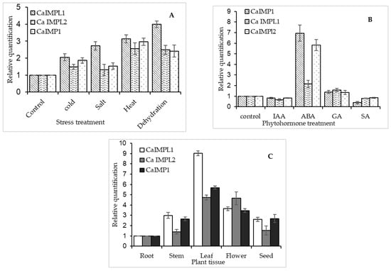 Relative expression analysis of CaIMP1, CaIMPL1, and CaIMPL2 transcripts using real-time PCR (A) seedlings with different abiotic stress treatments, (B) under treatment of seedlings with exogenous hormones, and (C) in different organs of chickpea plant. We used 18S rRNA as an endogenous control for normalizing the relative expression value of each transcript in all experiments, and it was calculated using the ΔΔCT method (Applied Biosystems, Foster City, CA, USA). The data depicted in the charts were obtained from the triplicate analysis of three replicates. Error bars designate ± SD standard deviation.