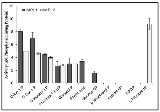 Activity of recombinant CaIMPL1 and CaIMPL2 with different substrates. The data depicted in the charts were obtained from the triplicate analysis of three replicates. Error bars designate ± SD standard deviation.
