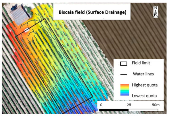High resolution RGB (20 Mp) and Parrot Sequoia Plus multispectral cameras installed in an Unmanned Aerial Vehicle (UAV), model DJI Phantom 4 Pro +, were used for obtaining images of the field. The multispectral camera has four band sensors: Green (550 BP 40), Red (660 BP 40), Red Edge (735 BP 10), and Near Infrared (790 BP 40). Using the altimetry data, a digital model of the terrain (MDT) was obtained, as well as the surface drainage model (using the ARCGIS (version 2.7.0) and Agisoft Photoscan software (version 1.6.2) [15]. Analyses considered Direção Geral de Agricultura Desenvolvimento Rural (1972), where the highest class and lowest corresponded to the land that enhances the surface runoff of the water and does not promote infiltration and to flat surfaces that can potentiate accumulation of surface water, respectively.
