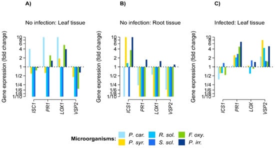 The phytopathogen filtrates induced the expression of defense genes in A. thaliana up to ten times more than in the control plants (Figure 1). However, not all of the phytopathogen filtrates enhanced gene expression to the same degree in roots and leaves. Most of the gene induction in the leaves concentrated on LOX1 (JA pathway) in plants exposed to filtrates of P. carotovorum, F. oxysporum, and P. irregulare (Figure 1). In the roots, most of the gene induction concentrated on ICS1 (SA pathway) by P. irregulare, P. syringae, and F. oxysporum (Figure 1). A. thaliana leaves infected with B. cinerea mostly induced the gene expression of either PR1 (SA pathway) or VSP2 (JA pathway), whereas the expression of ICS1 and LOX1 genes was minimal. However, the plants expressed either PR1 or VSP2, but never both to the same degree (Figure 1).