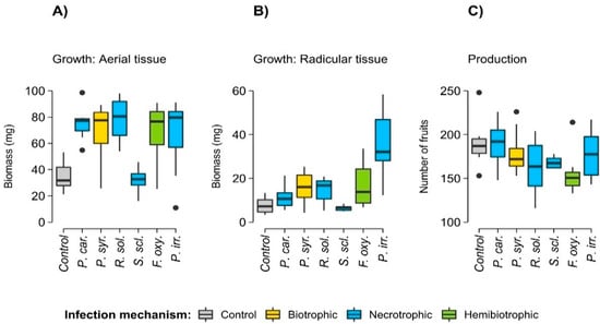 The plants that were exposed to the filtrate treatments exhibited greater aerial and radicular biomass compared to the control plants. However, the plants that were exposed to S. sclerotiorum filtrate were not different from the control plants (Table A2, Figure 2). Regarding fruit production, there were no differences between the plants that were treated with the filtrates and the control plants (Table A2, Figure 2).