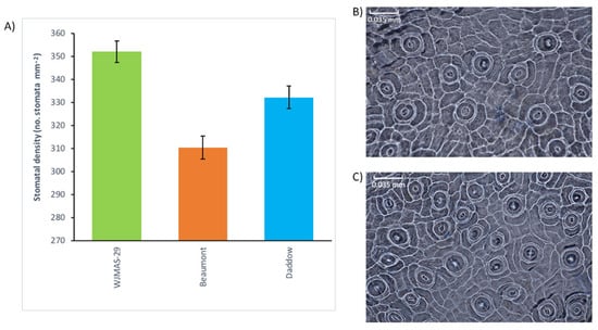 Effect of rootstocks on leaf stomatal density of HAES741. Error bars show the standard error (SE) of each mean. (A) Variability in stomata density due to three rootstocks. (B) Low stomatal density due to the effect of Beaumont. (C) High stomatal density due to the effect of WJMAS-29.