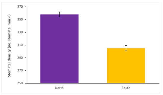 Mean leaf stomatal density of three macadamia rootstocks on northern crown position (purple) and southern crown position (yellow), using HAES741 as a common scion. Error bars show the standard error (SE) of each mean.