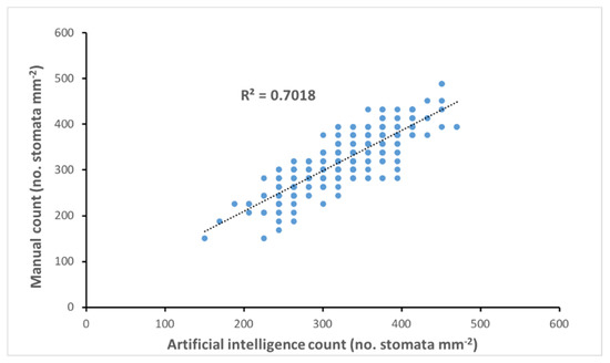 Stomatal counts were carried out using manual and AI methods, with the aim of establishing whether the AI method was of comparable accuracy to manual counting. We ran a correlation on the manual and AI data sets to assess the suitability of the technology for further studies. The results indicate there is a strong correlation between the two methods (R2 = 0.7018) (Figure 3).