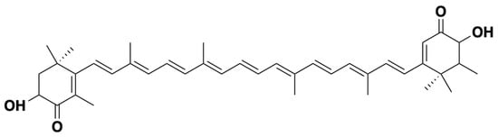 Astaxanthin (3,3′-dihydroxy-β-carotene-4,4′-dione) is part of the xanthophylls family—carotenoids-oxygenated derivatives. The basic skeleton is an unsaturated hydrocarbon chain with 40 carbon atoms with thirteen conjugated double bonds that are perfectly symmetrical with respect to positions 15-15′ (Figure 1).
