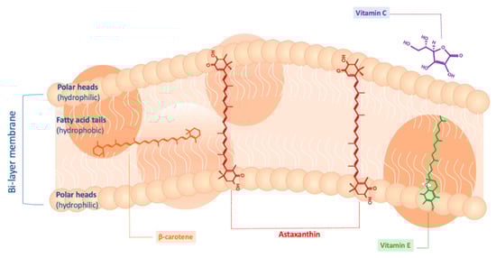 An antioxidant is a molecule able to inhibits oxidation and, thus, to prevent oxidative damages: Free radicals are produced by normal aerobic metabolism, in living organisms, to support vital processes. However, when excessive amounts of oxidative species react with cellular components, such as proteins, lipids and DNA through a chain reaction, they cause excessive oxidation, resulting in damage []. These cellular biochemical reactions that occur physiologically and produce free radicals can also be abnormally induced by external factors such as pollution, smoking, UV rays, prolonged stress, too much physical activity or the use of additives [,,]. Oxidative stress can be inhibited by endogenous and exogenous antioxidants: some foods represent great sources, as they are able to boost endogenous antioxidant systems. Carotenoids are endowed with very strong antioxidant ability: by extinguishing singlet oxygen (quenching) and eliminating radicals to end chain reactions, they can be considered excellent scavengers of peroxyl radicals that are able to interrupt the reactions that lead to oxidative damage of lipophilic compartments. The potential benefits of astaxanthin, administered as a dietary supplement, are explicated by several studies that show how its antioxidant activity is almost five times greater than β-carotene, three thousand times more powerful than resveratrol and even six thousand times more effective than vitamin C [,,]. By virtue of the unique characteristics of its chemical structure, astaxanthin is much more stable than other antioxidants: While most other molecules lose their antioxidant status after capturing a free radical (becoming pro-oxidant), astaxanthin retains only the antioxidant capacity and not the pro-oxidant capacity [,,]. Astaxanthin has the ability to establish effective protection against oxidative stress, neutralizing free radicals in both the inner and outer layer of cell membranes: In particular, it exerts antioxidant and anti-inflammatory properties in the mitochondria. Here, it neutralizes free radicals and protects the two membranes from oxidative stress [].