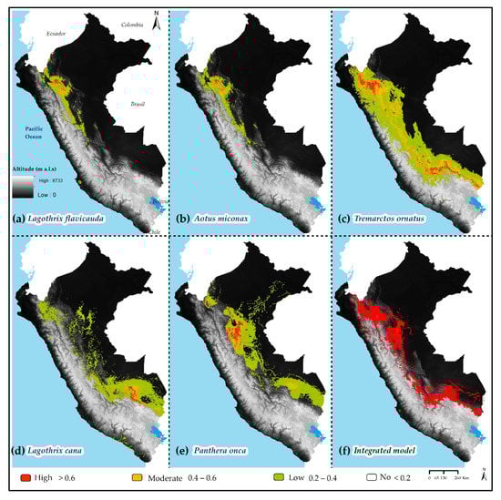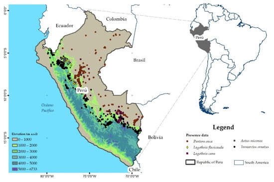 Peru is one of the 17 megadiverse countries in the world [,,], and to preserve this biodiversity in recent decades, national, regional, and private conservation areas have been created, with the aim of conserving species of high diversity and endemism, marine biodiversity, or particular groups of organisms [,,]. However, over time, anthropic pressures, such as deforestation, installation of agricultural crops, extensive livestock, illegal mining, and forest fires, among others, have reduced the habitat of native and endemic species, which has led to the reduction in their populations []. Based on this, Peruvian legislation [] and the International Union for Conservation of Nature (IUCN) red list of threatened species of wildlife have categorized the species in our study as described: critically endangered (CR) Lagothrix flavicauda, endangered (EN) Aotus miconax, vulnerable-status (VU) Tremarctos ornatus and Lagothrix cana, and near-threatened category (NT) Panthera once []. This situation describes the importance of knowing the territorial spaces in which to manage and implement plans for the survival of local populations, mitigating poaching and illegal trade [,].