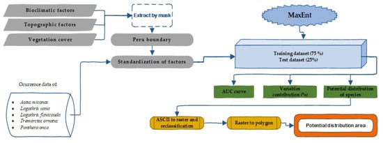 Therefore, species distribution models (SDM) are important tools in conservation approaches [], allowing the identification of geographical spaces with similar topographic characteristics, bioclimatic features, and records of presence []. SDMs have been widely applied in the identification of potential wildlife distribution in large mammals [] and flora species, the prediction of deforestation and forest fires [,,,], as well as the assessment of the impact of anthropogenic land-use change in protected areas []. The maximum-entropy algorithm (MaxEnt) is the one that presents reliable, optimal, and defensible results and surpasses other SDM algorithms [,,,]. In this study, using MaxEnt, we identified the biographical distribution under current conditions for an integrated management of the wild fauna of the species L. flavicauda, A. miconax, T. ornatus, L. cana, and P. onca in the Peruvian territory.