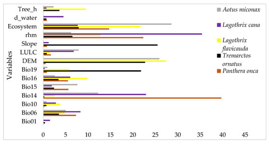 Modeling showed an average performance of AUC = 0.97, considered excellent (AUC > 0.9). Likewise, the bioclimatic variables with the greatest contribution to modeling were the precipitation of the driest month (Bio14) and relative humidity (rhm); in the same way, the variables such as altitude (DEM), type of ecosystem (ecosystem), and slope (slope) had a high contribution in the modeling of each species (Figure 4).