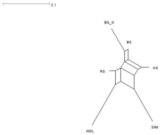 Analysis of the Neighbor Net graph (Figure 1) showed a presence of genetic relationships between the GS, BS, and RS groups as well as providing evidence for a common origin of the BS and BS_G groups. Holsteins and Simmentals formed separate branches.