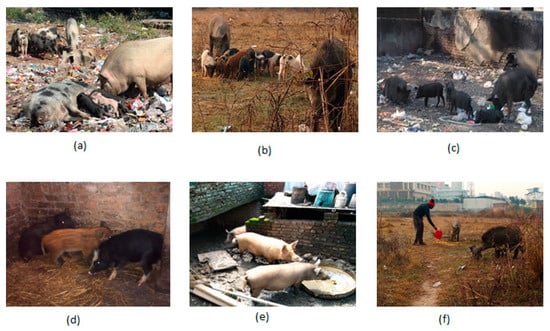 (a) Pig herd in Ramnagar (Nainital district of Uttarakhand) (b) Pig herd of mixed parental origin observed in Chandrabani (Dehradun district of Uttarakhand) (c) Pig herd in Jwalapur (Haridwar district of Uttarakhand) (d) Possible hybridized feral origin or boar piglet for sale or mating purpose (e) Semi-intensive system of pig management with housing facility (all the pen is made of brick with tin as a roof within the house premises) (f) Extensive system of pig management with no housing facility.