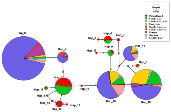 Median-joining haplotype network of 18 haplotypes identified in Uttarakhand sample and its sharing with global sequences (n = 998). Circle size represents the frequency of individuals, and color defines the region-wise populations. Small black circles represent median vectors. Mutational steps are shown by bar on the respective branches.
