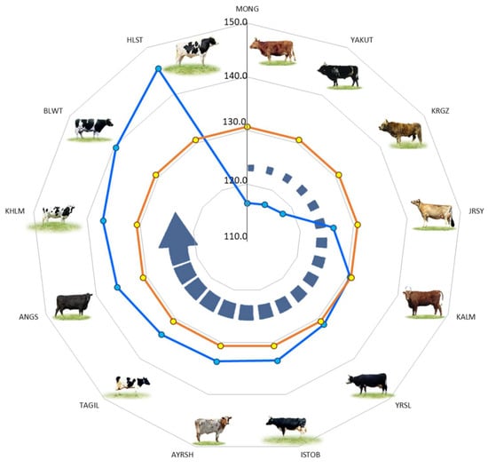 Distribution of cattle breeds according to the mean values for the height at withers. Blue line indicates the mean values calculated for each of the studied breeds; orange line indicates the mean value calculated for the entire data set; the breeds are located clockwise from the breed having the lowest stature (Mongolian cattle) the breed revealing the greatest stature (Holsteins) as it is indicated by an arrow; the breeds’ abbreviations are deciphered in the Materials and Methods section.