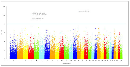 Genome-wide association studies (Figure 2) revealed four SNPs, which are strongly associated with the stature, including three SNPs at 77.3–77.8 cM on BTA4 (map53144-ss46525999, p < 7.747 × 10−101; BovineHD0400021479, p < 1.173 × 10−91; ARS-BFGL-NGS-116590, p < 7.665 × 10−105) and one SNPs at 25.2 cM on BTA14 (BovineHD1400007259, p < 1.324 × 10−109).