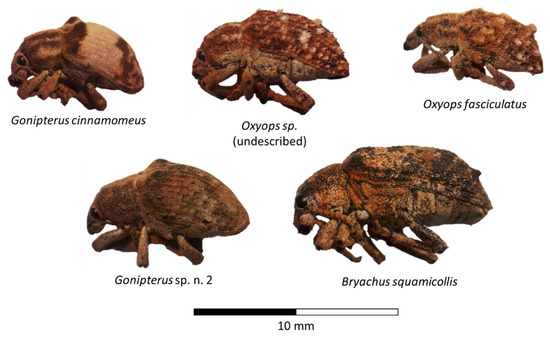 The five Gonipterini weevil species investigated in this study. Photographs are to scale.
