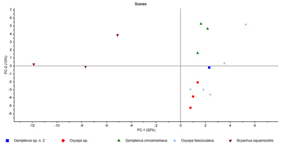 In order to visualize the broad differences in CHC composition between species, principal component analysis (PCA) was performed on the normalized CHC dataset. As can be seen from the scores plot in Figure 2, B. squamicollis was well separated from the remaining species, while the Gonipterus specimens were located toward the centre of the plot. The undescribed Oxyops species showed some overlap with O. fasciculatus, although it was slightly more separated across the third principal component (data not shown).