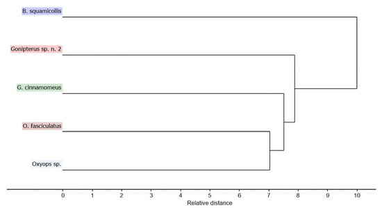 Hierarchical cluster analysis, performed on the normalized GC-MS data using the Euclidean distance with Ward’s method of clustering, displayed similar results. Bryachus squamicollis was again identified as the outlier taxon, while the two Oxyops species were most closely related in terms of their CHC composition (Figure 3).