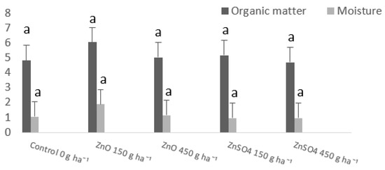 On the other hand, nutrient uptake in plants is dependent on soil pH, water content and organic matter [17,19]. Yet, there are other factors in soils that interfere with the bioavailability of nutrients, those relations being a result of the combined properties of soils [20]. In this context, the organic matter and moisture data of this study showed no significant differences in the soil samples (Figure 2). Thus, these two soil parameters did not influence the differences observed with Zn fertilization in this experimental study. For the production of vines, a suitable soil pH is in the range between 5.5–8 (i.e., slightly acid and neutral), providing better growing conditions as it leads to an adequate amount of essential nutrients [21]. In the Fernão Pires field, pH presented values ranging from 6.4 to 7 (except for one sampling site with 7.6) (Figure 1). These conditions were suitable for grape production, therefore, also for the performance of this study.