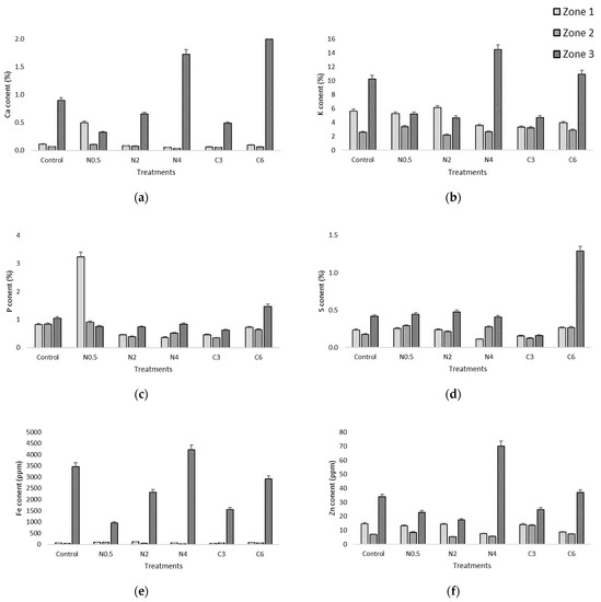 Average of Ca (a), K (b), P (c), S (d), Fe (e), and Zn (f) contents of three replicates of three independent series (from center to epidermis, 1–3) in tubers of Solanum tuberosum L., cv. Agria, 3 months after harvest (under storage conditions). Foliar spray was carried out with three concentrations of Ca(NO3)2 (0.5 (corresponding to N0.5), 2 (corresponding to N2), and 4 (corresponding to N4) kg·ha−1) and two concentrations of CaCl2 (3 (corresponding to C3) and 6 (corresponding to C6) kg·ha−1). The control was not sprayed.