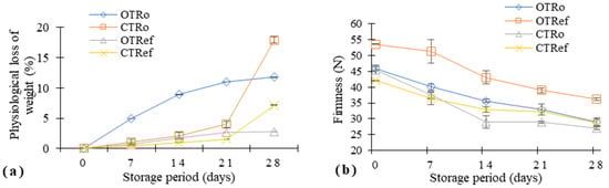 Physiological loss of weight is a key factor in the shelf life of fresh fruits and vegetables. The weight loss was found to be predominant on CTRo compared to OTRo on the 28th day of ambient storage condition, as depicted in Figure 1a. In the case of refrigerated storage conditions, CTRef showed a higher range of water loss on the 28th day of storage. The physiological loss of weight was observed in both samples regardless of cultivation method and storage conditions. Similar results were obtained by Eboibi et al. [], where the loss of fruit mass was evident regardless of production method and calcium chloride treatment. The loss of weight affects the quality of fruits and vegetables, which is mainly due to excessive loss of moisture through metabolic activity such as respiration and transpiration processes [].