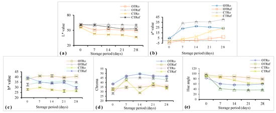 Changes in color attributes of organic and conventional tomatoes during storage: (a) L* value (lightness: black—0, white—100); (b) a* value (+ redness; − greenness); (c) b* value (+ yellowness; − blueness); (d) Chroma; (e) Hue angle; OTRo—Organic tomatoes at ambient storage; OTRef—Organic tomatoes at refrigerated storage; CTRo—Conventional tomatoes at ambient storage; CTRef—Conventional tomatoes at refrigerated storage; data are mean ± SD (n = 3).