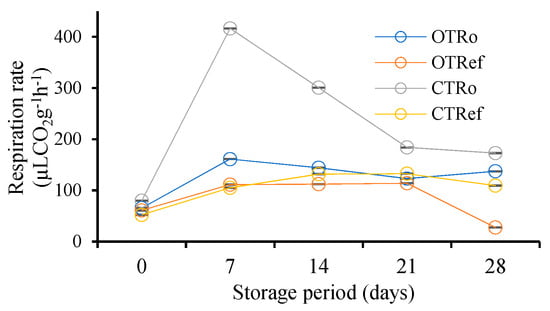 Changes in respiration rate of organic and conventional tomatoes during storage; OTRo—Organic tomatoes at ambient storage; OTRef—Organic tomatoes at refrigerated storage; CTRo—Conventional tomatoes at ambient storage; CTRef—Conventional tomatoes at refrigerated storage; data are mean ± SD (n = 3).