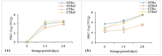 Microbial stability of organic and conventional tomatoes: (a) Yeast and molds count (YMC), (b) Aerobic mesophilic count (AMC); OTRo—Organic tomatoes at ambient storage; OTRef—Organic tomatoes at refrigerated storage; CTRo—Conventional tomatoes at ambient storage; CTRef—Conventional tomatoes at refrigerated storage; data are mean ± SD (n = 3).