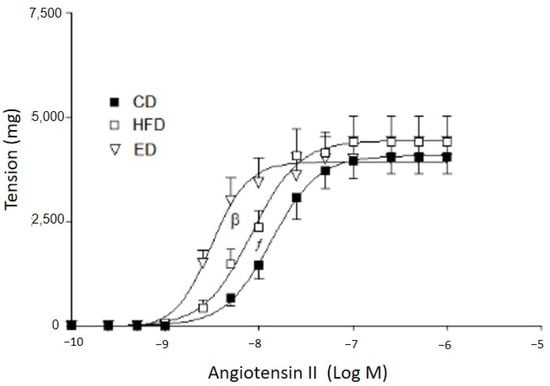 Concentration–response curve to angiotensin II. CD: regular diet; HFD: high-fat diet; ED: expeller diet. β p < 0.05 indicates statistically significant differences between pEC50 of arteries from rabbits fed on ED and the other diet groups (one-way ANOVA). ƒ p < 0.05 indicates statistically significant differences between pEC50 of arteries from rabbits fed on HFD and CD (one-way ANOVA).