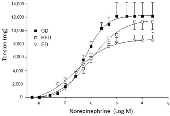 Concentration–response curve to norepinephrine. CD: regular diet; HFD: high-fat diet; ED: expeller diet. * p < 0.05 indicates statistically significant differences between Rmax of arteries from animals fed on ED and the other diet groups (one-way ANOVA).