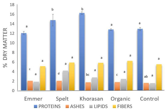 Proximate composition of the organic ancestral wheats comparing to modern wheats (organic and control). Data are expressed as mean ± standard deviation (n = 3), Values in bars followed by the same letter, in the same parameter, are not significantly different at 95% confidence level (p < 0.05).