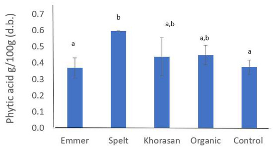 Phytic Acid content in ancestral wheats. Data are expressed as mean ± standard deviation (n = 3), Values in bars followed by the same letter are not significantly different at 95% confidence level (p < 0.05). Dry basis, d.b.