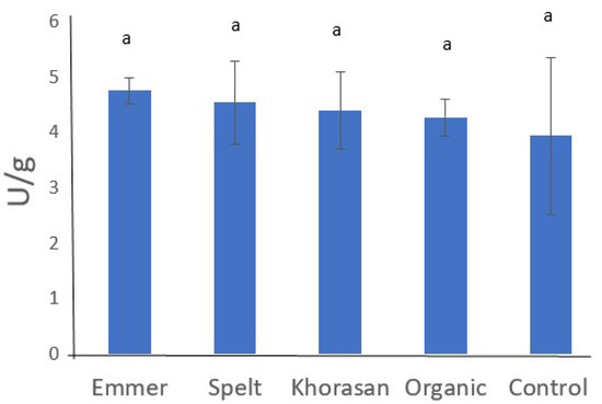 The moisture values obtained for the wheats analyzed were very similar, the high moisture value is for spelt, control and organic wheat, emmer, followed by khorasan, respectively. It should be noted that khorasan wheat has the highest protein value of the ancestral varieties studied (approximately more than 30% respect to the control) followed by spelt wheat (Figure 2). The other wheats, such as emmer, control and organic, presented significantly lower values than the previous ones. It is important to remark that all wheats have the proteins which form the gluten. However, ancient wheats, despite having higher protein contents, they do not present higher gluten (data does not show).