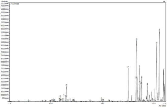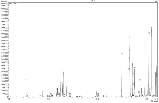 Chromatogram of M. recutita essential oil obtained by steam distillation.