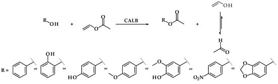 The syntheses of acetate esters of benzyl alcohol and its derivatives were carried out according to Figure 1. Briefly, the reactions were performed in 25 mL of isooctane and 2 mmoles of chosen alcohol and vinyl acetate. Candida antarctica lipase B (10% w/w by the mass of substrates) was used as a biocatalyst. The reactions were carried out at 37 °C at 250 rpm on a rotary shaker for 72 h. Tautomerization of vinyl alcohol to acetaldehyde results in shifting the equilibrium state towards the formation of the esters.