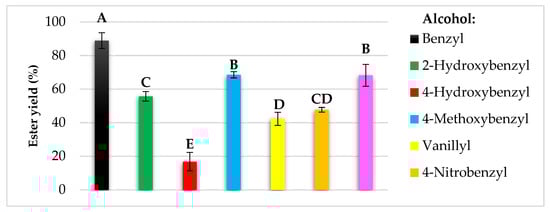 The yields of enzymatic syntheses of esters of benzyl alcohol and its derivatives. The bars present the means ± SD of isolated yields. Yield: 100 × (actual quantity received/ideal quantity calculated). Means with the same capital letter (A–E) did not differ significantly (α = 0.05).