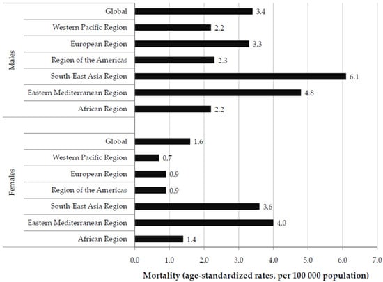 In 2019, the global ASR of LOC cancer mortality was 3.4 per 100,000 in males vs. 1.6 per 100,000 in females (Figure 1). Males had higher ASRs compared with females in 2019 in all WHO regions. The highest ASR in males was found in the South East Asia Region (6.1 per 100,000), while the highest rate in females was reported in the Eastern Mediterranean Region (4.0 per 100,000).