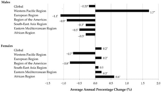 Only in females in the South East Asia Region was a non-significant increase observed (by +0.1% per year). In only one WHO region—Region of the Americas, in both sexes—a significant decrease in LOC cancer mortality rates was observed: AAPC = −0.9% (95%CI = −1.0 to −0.9) in males, and AAPC = −0.8%, (95%CI = −0.8 to −0.7) in females.