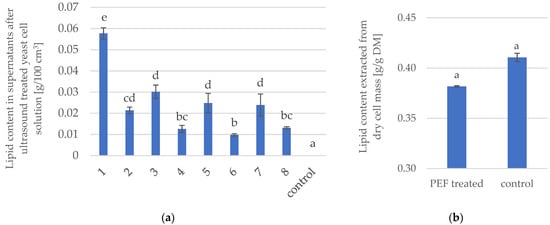 (a) Lipid content in supernatants after ultrasound treated yeast cells [g oil/100 cm3]. (b) Microbial oil content extracted from dry biomass of PEF-treated Y. lipolytica yeast. Homogeneous groups designated on the basis of Tukey’s test were identified by letters and different posts. Number of treatment refers to individual process parameters according to Table 1 (a) or Table 2 (b). Control is untreated yeast cells.