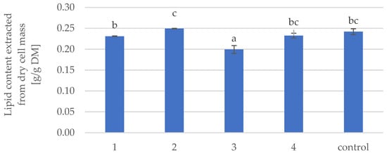 Based on the literature, using high-pressure homogenization at 2000 bar, with 15 passes of the sample through the homogenizer, the efficiency of lipid extraction from Saitozyma podzolica DSM 27192 yeast cells after Folch extraction was 37.8% [9]. There are other studies that also used high-pressure homogenization against a 15% solution of Y. lipolytica JMY5578 yeast cells. The biomass solution was passed through a homogenizer 20 times at a pressure of 1500 bar. The conditions used resulted in an oil extraction of 83.9% from the dried biomass compared to a control of 19.8% [10]. This may indicate that the high-pressure homogenization conditions used in the present study were too mild to perforate yeast cell structures and consequently increase the efficiency of intracellular oil extraction with the Folch method. Only the use of high-pressure homogenization (10 × 1100 bar) could be considered as a method for preparing yeast biomass for proper intracellular lipid extraction.