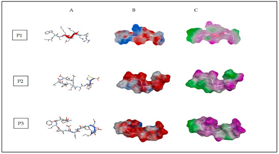 Three-dimensional representation of P1 (IWCKDDQNPH), P2 (DKFLDDDLTDDIM), and P3 (DKFLDDDLTDDIM) rendered by MOE showing conformations at 50 ns of the simulation. The P1 region that adopts an alpha helix structure contains KDDQ residues (A) and two molecular surfaces showing electrostatics. Blue indicates positively charged areas; red indicates negatively charged areas (B) and lipophilicity. Green indicates lipophilic areas; pink indicates hydrophilic areas (C).