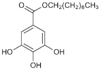 Antimicrobial assay: The heat-sensitizing effect of benzaldehyde analogs, currently used as food additives/derivatives [8], was examined using the mycotoxin-producing fungus Aspergillus flavus. Test samples were treated with mild heat (57.5 °C) or maintained at room temperature (RT; 22.0 °C), then entire samples were cultured for 48 h at 35 °C onto the recovery agar (potato dextrose agar (PDA)) plates. Then, the most effective benzaldehyde analog, octyl gallate (OG; octyl 3,4,5-trihydroxybenzoic acid) (Figure 1, structure), was examined further at 0.1 to 0.3 mM to determine the optimum treatment condition (mild heat (57.5 °C) or RT (22.0 °C)).