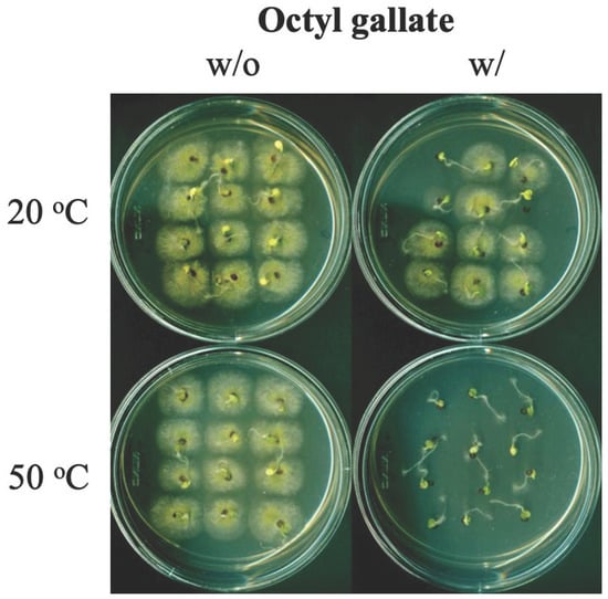 Representative assay showing enhanced seed sanitation via octyl gallate-mediated heat sensitization (hurdle technology). Co-treatment of octyl gallate at 3 mM and mild heat (50 °C) for 20 min completely inhibited the growth of A. flavus on the surface of seeds while the frequency of seed germination was unaffected.