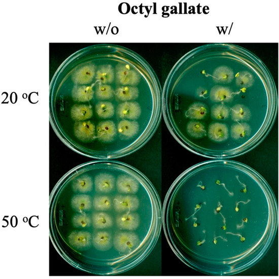 Representative assay showing enhanced seed sanitation via octyl gallate-mediated heat sensitization (hurdle technology). Co-treatment of octyl gallate at 3 mM and mild heat (50 °C) for 20 min completely inhibited the growth of A. flavus on the surface of seeds while the frequency of seed germination was unaffected.