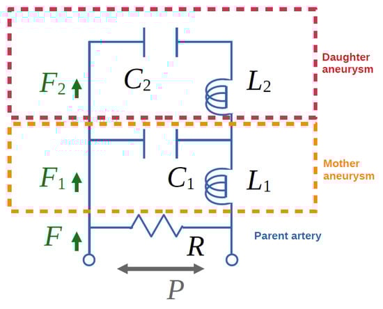 where F(t) and P(t) mean the blood flow and the blood pressure of the parent artery, respectively. The quantity Q1(t) and Q2(t) denote the amount of blood inside the mother and daughter aneurysms, respectively. The quantity R is the resistance associated with the neck size, which is taken to be low for most of the blood flows going through the parent vessel. As the oscillation of flows possibly appear inside aneurysms, the flows F1(t) and F2(t) can be either positive, zero, or negative (for the default direction of the flows inside the aneurysms, see Figure 2).