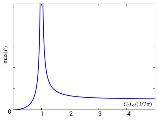 Maximum amplitude of F2 as a function of . Resonance appears if is satisfied.