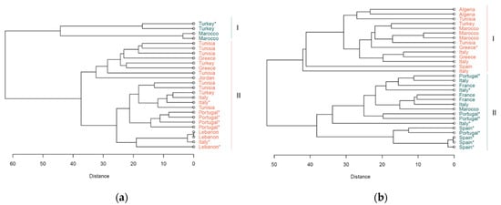 Cluster analysis was performed to determine the similarity between EO compositions from samples of P. pinea from different provenances (Figure 1a). Two main clusters were obtained, one cluster grouped exclusively EOs from Moroccan pine trees and some EOs from Turkey (Cluster I), while the remaining EOs were grouped together in a separate cluster (Cluster II). Cluster analysis revealed no separation based on geographic location of plant material used for EO extraction.